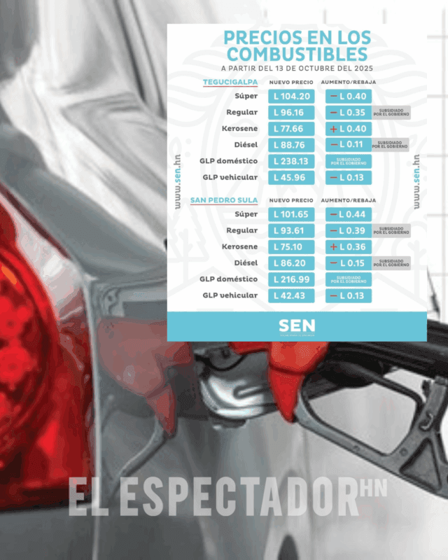 En Tegucigalpa, la gasolina súper bajará ligeramente a L104.20 por galón y la regular se ajusta a L96.16. Por su parte, el kerosene sube a L77.66 y el diésel subsidiado se mantiene en L88.76. El GLP doméstico seguirá a L238.13 y el GLP vehicular disminuirá a L45.96 por galón.
