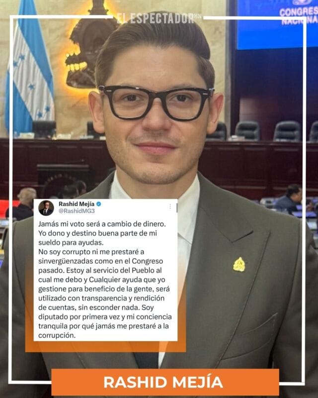 El diputado del Partido Liberal, Rashid Mejía, afirmó que su voto en el Congreso Nacional no está condicionado a intereses económicos y rechazó cualquier práctica de corrupción dentro del Poder Legislativo. En ese contexto, Rashid Mejía insistió en que su actuación se mantiene firme frente a cualquier presión política o financiera.