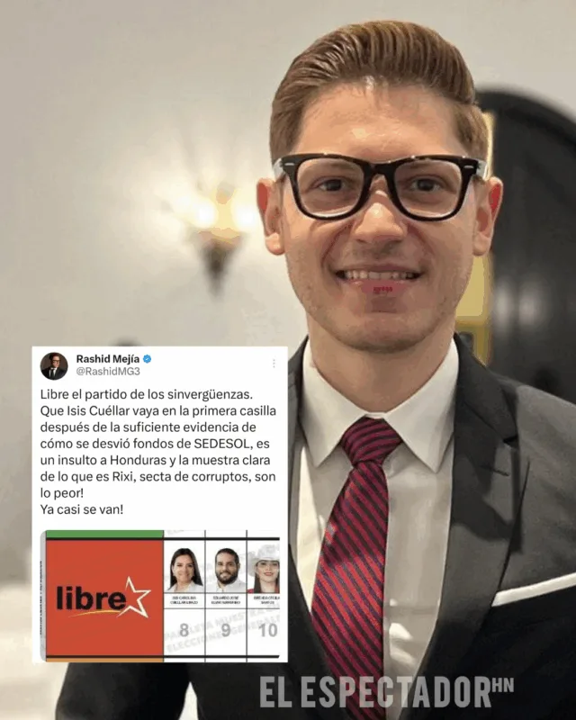 “Que Isis Cuéllar vaya en la primera casilla después de la suficiente evidencia de cómo se desviaron fondos de SEDESOL, es un insulto a Honduras y la muestra clara de lo que es Rixi, secta de corruptos, son lo peor. ¡Ya casi se van!”, escribió Mejía en sus redes sociales, haciendo énfasis en la corrupción que vincula a la diputada con la gestión de recursos públicos.