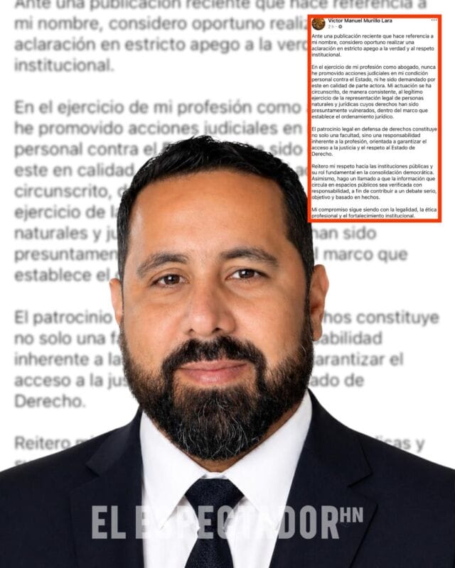 El abogado Víctor Manuel Murillo Lara emitió un pronunciamiento público en el que aclaró señalamientos surgidos a raíz de una publicación que hace referencia a su nombre, asegurando que su actuación profesional ha sido conforme al marco legal vigente en Honduras.